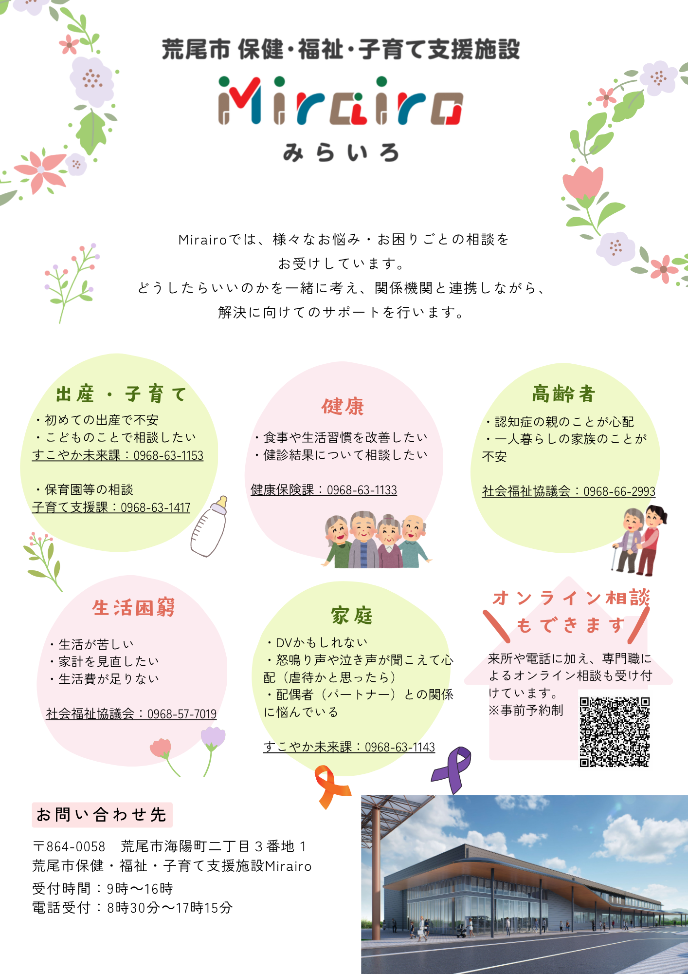 荒尾市保健・福祉・子育て支援施設Mirairoでは、様々なお悩み・お困りごとの相談をお受けしています。